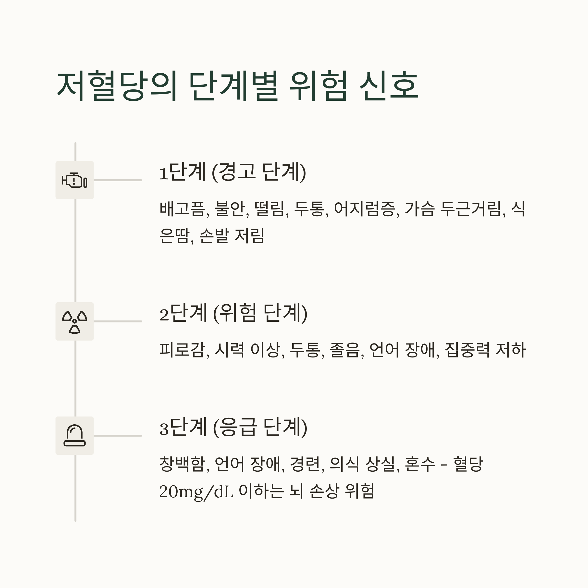 - 1단계 (경고 단계): 초기 증상으로 배고픔, 불안, 떨림, 두통, 어지럼증, 가슴 두근거림, 식은땀, 손발 저림 등이 나타납니다.