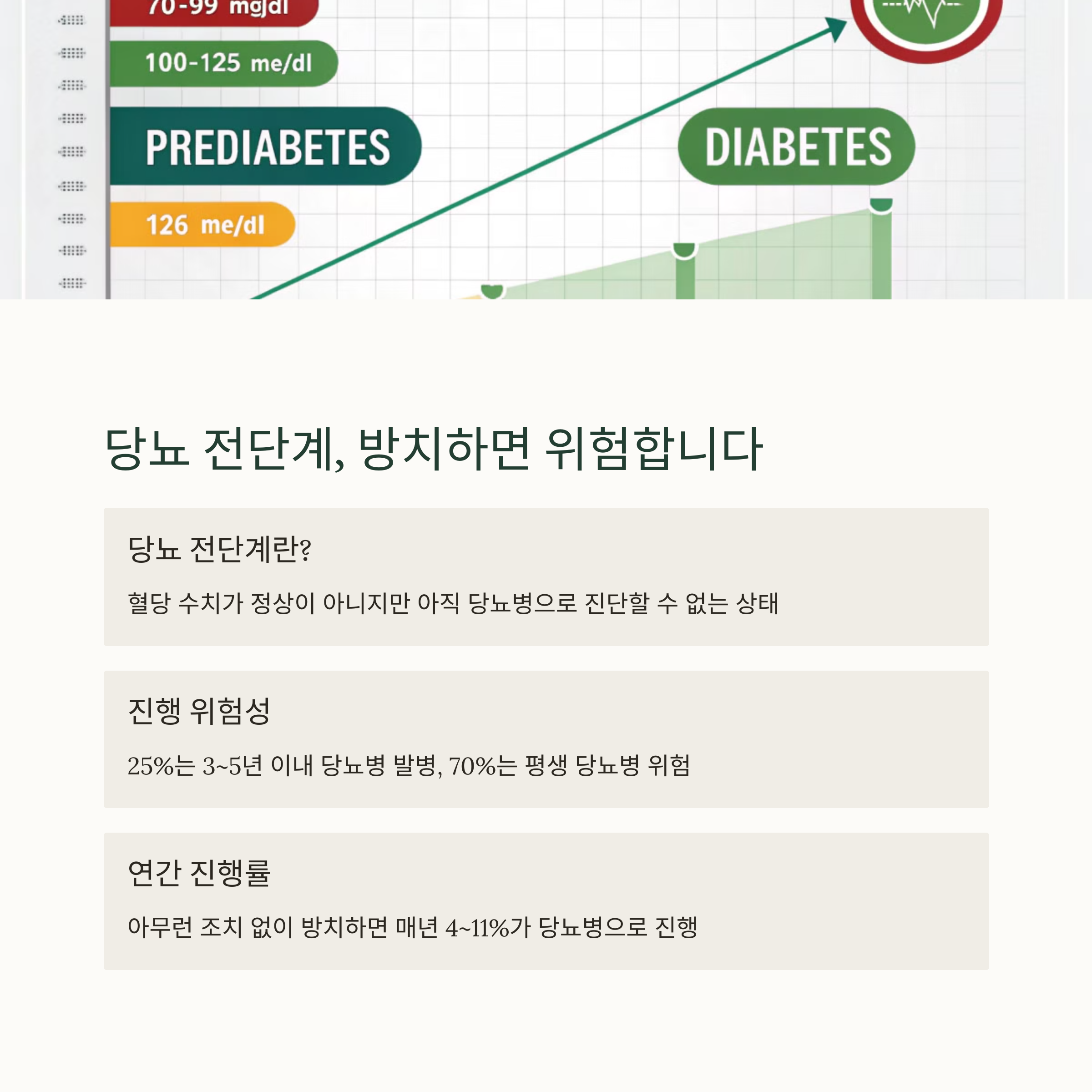 당뇨 전단계는 혈당 수치가 정상이 아니지만 아직 당뇨병으로 진단할 수 없는 상태를 의미합니다. 문제는 당뇨 전단계에서 당뇨병으로 진행될 확률이 매우 높다는 것입니다. 당뇨 전단계 환자의 25%는 3~5년 이내에 당뇨병으로 진행되며, 70%는 평생 당뇨병을 앓게 될 위험이 있습니다. 또한, 아무런 조치 없이 관찰하면 매년 4~11%가 당뇨병으로 진행됩니다.
